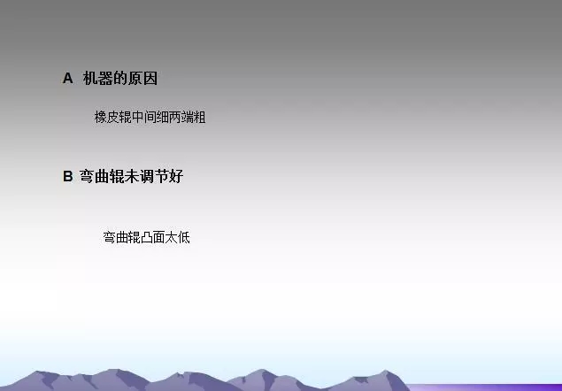 背輥及各過(guò)輥粘有異物或使用過(guò)多的水。需要經(jīng)常檢查,及時(shí)發(fā)現(xiàn)并清理,并注意不要損傷輥面。